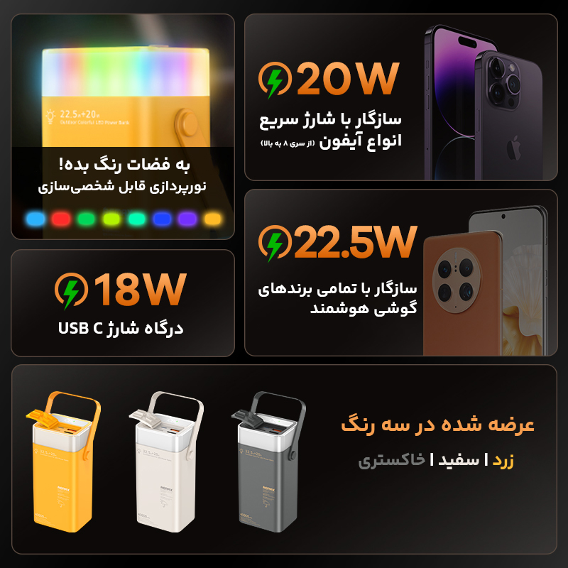 ظرفیت بسیار بالا, شارژ سریع, چند پورت خروجی: نمایشگر LED, طراحی مقاوم, باتری لیتیوم پلیمری