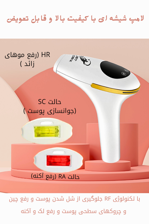 3 قابلیت مختلف مود (حالت HR رفع موهای زائد ) ، (حالت رفع آکنه تنظیم RA ) ، ( جوانسازی پوست حالت SC)