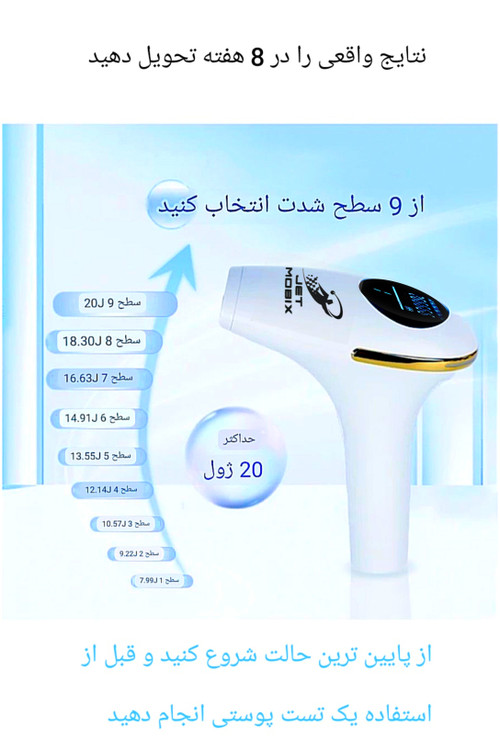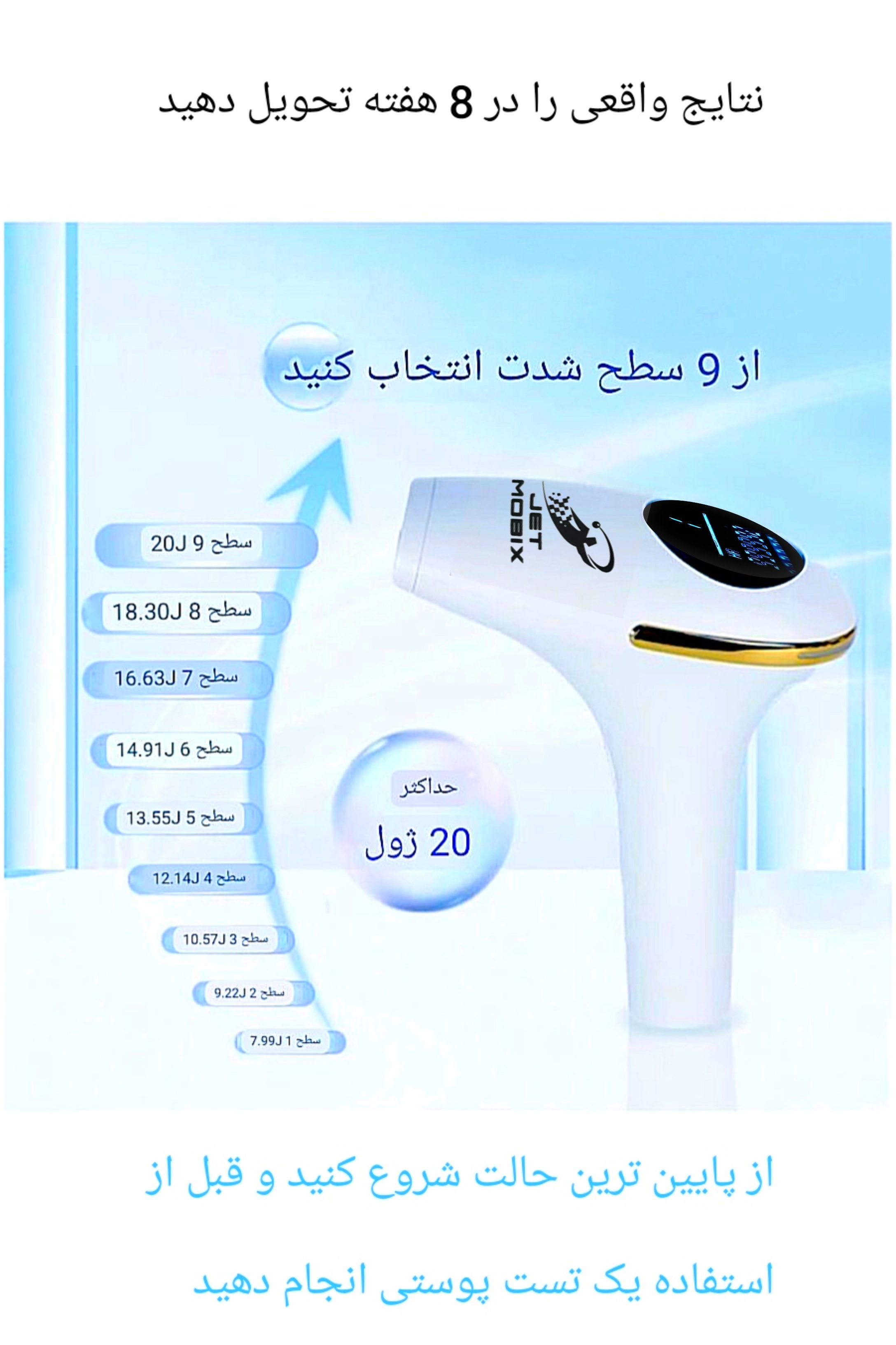 دستگاه لیزر موهای زائد بدن و صورت جت موبیکس مدل با قابلیت 1 میلیون شات ، از پیشرفته ترین LM01 3in1 لیزرهای 3 کاره تولیدی شرکت جت موبیکس میباشد که با طراحی جدیدترین محصول خود یک کلینیک زیبایی تمام عیار را به شما ارائه داده است . دستگاه لیزر چندکاره جت موبيكس ، 3 قابلیت مختلف برای رفع موهای زائد جوان سازی پوست با تکنولوژی RF جلوگیری از شل شدن پوست و رفع چین و چروکهای سطحی پوست و رفع لک و آکنه دارد. با وجود این دستگاه ، کلینک شخصی خود را در منزل خواهید داشت و از صرف وقت و هزینه های گزاف کلینیکی بی نیاز خواهید شد. با استفاده از کنترل پنل لمسی بر روی دستگاه میتوانید سطح انرژی تابیده شده این لیزر را در 9 وضعیت مختلف تنظیم کرد و دستگاه را بر 3 مود حالت ( HR رفع موهای زائد ) ، ( حالت RA رفع آکنه ) جوانسازی پوست حالت SC ) تنظیم نمود. یکی از نکات مثبت این لیزر قدرتمند تعداد شات بالای این محصول است که نسبت به سایر لیزرهای موجود بسیار زیاد است. تعداد شات لیزر جت موبيكس بیش از یک میلیون شات بوده و در شرایط عادی این تعداد شات حداقل برای 15 نفر قابل استفاده خواهد بود . همچنین از دیگر ویژگیهای جذاب این لیزر ، سرعت بالای شات های آن است که باعث میشود به سرعت و بدون احساس درد از شر موهای زائد خلاص شوید این دستگاه قابل استفاده برای خانمها و آقایان است . با استفاده از کنترل پنل بر روی دستگاه میتوانید سطح انرژی تابیده شده این لیزر را در 9 وضعیت مختلف تنظیم کرد . لیزر چند کاره Jet Mobix به دو صورت دستی و اتومات شات میزند ، هنگامی که دستگاه را روشن میکنید به صورت پیش فرض روی حالت دستی می باشد و با فشردن هربار دکمه اصلی ، دستگاه یک شات میزند و برای تغییر از حالت دستی به اتومات میبایست پس از روشن کردن دستگاه دکمه شات زن دستگاه را برای مدت 5 ثانیه نگه دارید تا بر روی نمایشگر محصول عبارت AUTO ،نمایش دهده به صورت اتوماتیک با نزدیک کردن به سطح دستگاه شات میزند زمان استفاده موثر از این دستگاه بین 2 الی 6 ماه است که برای هر فرد متفاوت میباشد. در ماه اول هفته ای 2 الی 3 مرتبه و در ماه دوم به بعد هفته ای یک مرتبه باید از دستگاه استفاده کنید تا سریع ترین نتیجه را مشاهده کنید این محصول دارای تاییده های پزشکی CE, RohsPSE, UKCA می باشد .