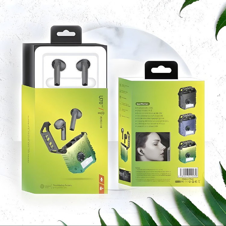 هدفون بلوتوثی مدل U70 با داشتن طراحی ارگونومیک که موجب میشود تا هیچ گونه مشکلی در استفاده طولانی مدت برای کاربر پیش نیاید میتوان از این ایربادها برای امور روزانه مانند گوش دادن به ، موزیک امکان تماس تلفنی چت و حتی برای گیمینگ استفاده شود. این محصول از پروتکل IPX7 پشتیبانی میکند و در مقابل تعریق دارای مقاومت کافی است میتوان هنگام ورزش نیز از آن بهره برد. هدفون بلوتوثی مدل U70 از نظر باتری مخصوصا ظرفیت باتری پاورکیس Pro بسیار غنی میباشد ظرفیت باتری پاورکیس این محصول 300 میلی آمپر ساعت است و ظرفیت باتری هر کدام از ایربادهای این هندزفری بیسیم 35 میلی آمپر ساعت میباشد که میتواند حدود 4 الى 5 ساعت به صورت مستمر استفاده شود ایربادها برای اتصال به گوشی های هوشمند از اتصالی پایدار تا فاصله 10 متری برخوردار می باشد. هدفون بلوتوثی مدل U70 با ارائه صدای استریو با کیفیت HIFI میباشد. هندز فریهایی و سایر تجهیزاتی که دارای کیفیت HIFI هستند صدای تولید شده را بدون هر گونه تغییری در فرکانسهای اولیه و با امانت به گوش کاربر میرسانند که در این هندزفری بی سیم نیز این قابلیت موجود میباشد و صدا با همان کیفیت مطلوب اولیه و بدون هیچ گونه تغییری به گوش کاربر می رسد