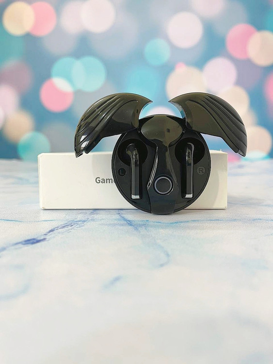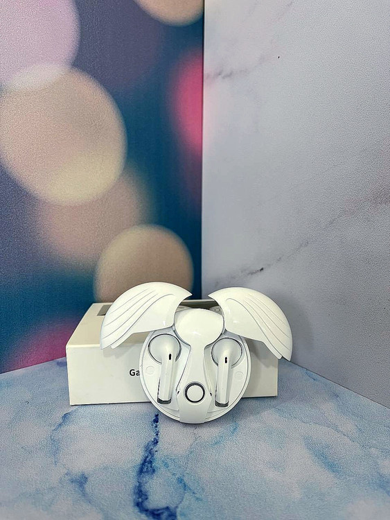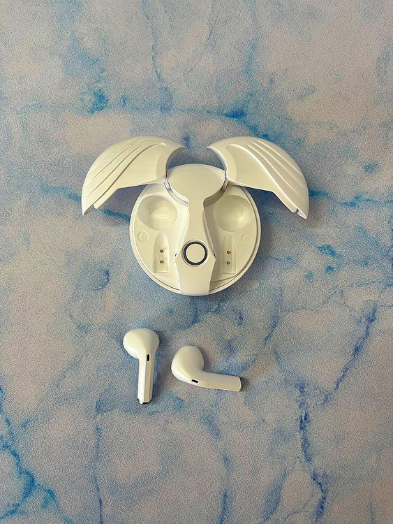 ترجمه این تصویر جعبه یک جفت هدفون بیسیم واقعی (TWS) با نام "Angel Wings" (بالهای فرشته) مدل HZC-80 را نشان میدهد.