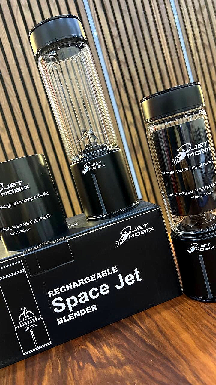 شیکر و مخلوط کن شارژی جت موبیکس مدل space jet یک محصول ضد آب و با اصالت ساخت کشور تایوان است که با بدنه استیل و تیغه 6 جهته استنلس استیل و استفاده از موتور پرقدرت 126 وات (موتور براش دریل شارژی برای این محصول استفاده شده) میتواند به راحتی یخ را بدون استفاده از مایعات برای شما خرده کند و شما می توانید تمامی اسموتی ها، شیک ها و نوشیدنی های بر پایه یخ را با این محصول درست کنید و حتی دانه های سخت مانند دانه فلفل سیاه یا زنجبیل یا جوز هندی و ... را به راحتی خرد و آسیاب کنید. این محصول را میتوانید در آشپزی ، ورزش و در سفر و تفریحات استفاده کنید و لذت ببرید .