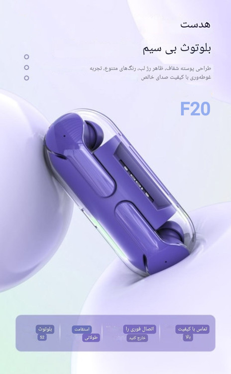 هندزفری بلوتوثی مدل F20 یکی از بهترینها برای برقراری تماسهای شفاف واضح و باکیفیت است . کیفیت این هندزفری به گونه ای میباشد که شما مکالمهی رودررو را تجربه خواهید کرد کیس نگهدارنده و شارژ تنها برای 3 الی 5 ساعت کارکرد در روز به 2 ساعت شارژ احتیاج دارد . کیس این هندزفری بلوتوث با تکنولوژی fast charge از طریق پورت USB Type - C شارژ میشود . طراحی ارگونومیک منحصر به فرد F20 برای ایرپاد به گونه ای است که کاملا در گوش فیت شده و میتوانید مطمئن باشید که نمیافتد با استفاده از این محصول شما به به بلوتوث نسخه 5.0 مجهز شده و برد 10 متری آن سبب شده که تا فاصله 10 متری بتوان از آن استفاده کرد و هر چیزی که از دستگاه پخش میشود را شنید. این هدفون موفق به کسب استاندارد IPX4 شده و به این معنی است که به خوبی در برابر آب و گرد و غبار مقاومت میکند. البته به این موضوع توجه داشته باشید که این هندزفری را نباید زیر جریان مستقیم آب قرار دهید. جنس بدنه این هندزفری حرفه ای از پلاستیک با کیفیت ABS ساخته شده است