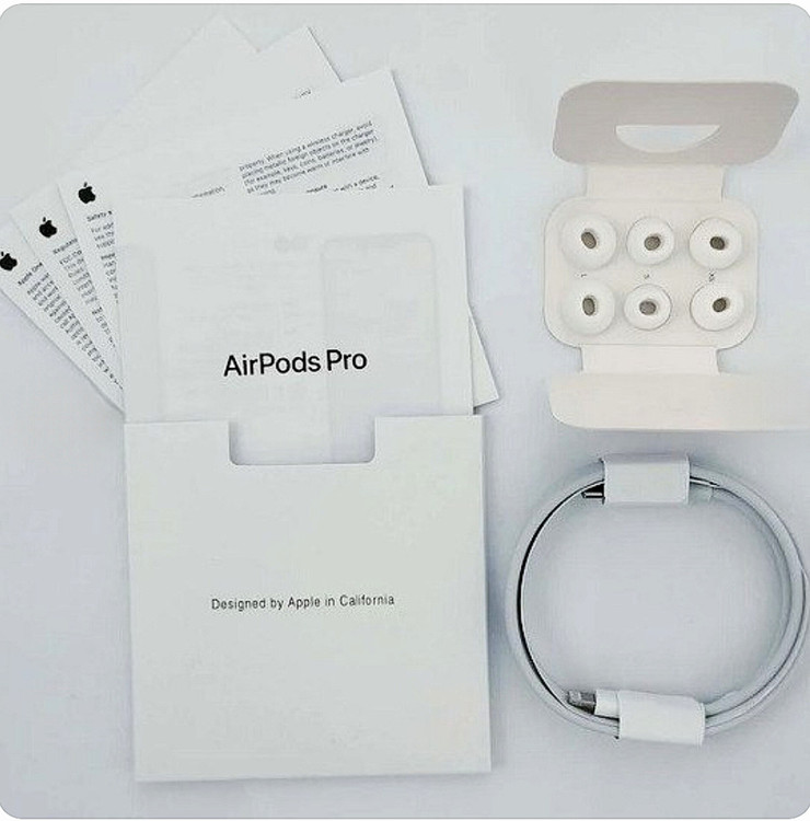 ایرفون AirPods Pro 2nd Gen همراه با کابل شارژ Type-C به Type-C، سه سری سیلیکونی در سایزهای مختلف و دفترچه راهنما عرضه میشود. این سریهای سیلیکونی کمک میکنند تا هدفونها به خوبی در گوش شما قرار بگیرند بدون اینکه صدای اضافی وارد گوش شود. همچنین در حین دویدن نیز از افتادن هدفون بر اثر حرکت جلوگیری میکند.
