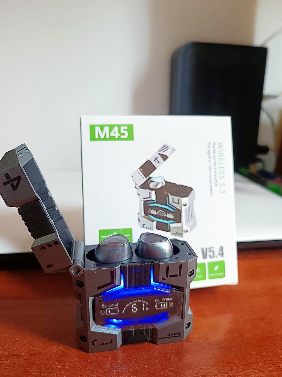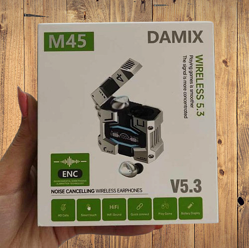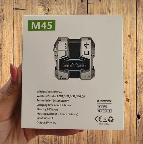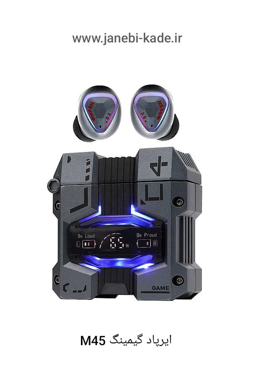 هندزفری بلوتوثی گیمینگ مدل M45. یک ایرپاد مخصوص بازی و استفاده روزانه است که با طراحی اسپرت و افکت های لامپ های 7 رنگ RGB ظاهر جذابی به این محصول داده است. این مدل برای اتصال به دستگاه به بلوتوث نسخه 5.3 مجهز شده است و در مدت زمان کوتاه ، اتصال با گوشی موبایل اندروید یا ios شما برقرار خواهد شد.از ویژگیهای اصلی این محصول محفظه نگهدارنده یا همان کیس آن است. این کیس قابلیت شارژ هدفون را دارد. برای شارژ آن کافی است از درگاه USB-C تعبیه شده بر روی کیس و کابل شارژ درون بسته بندی استفاده کنید. همچنین این ایرپاد گیمینگ دارای یک میکروفون با کیفیت است و این ویژگی ، آن را برای مکالمه مناسب میسازد . از قابلیت های این محصول میتوان به ضد آب بودن ، فعال بودن Siry در آیفون ، HD Voice و ENC اشاره کرد. زیر این محصول یک پورت خروجی USB نیز قرار دارد که به وسیله آن میتوانید از باتری ایرپاد به عنوان پاور بانک اضطراری نیز استفاده کنید